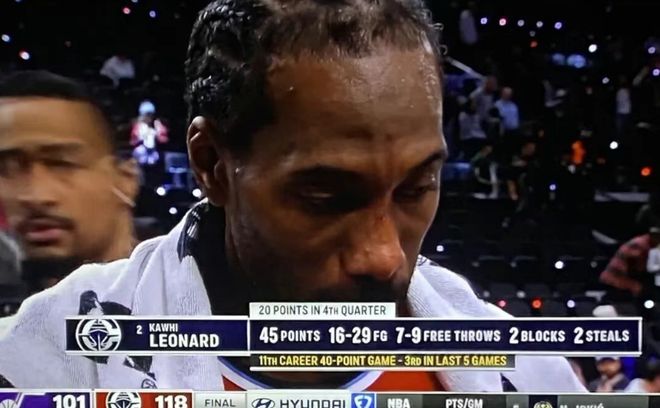 当场比赛第四节最后2分钟,伦纳德在防守中踩到对手当场倒地。即便他最后选择咬牙坚持,但最后时刻连续叁分偏出,而后就直接缺席了整整10场比赛。