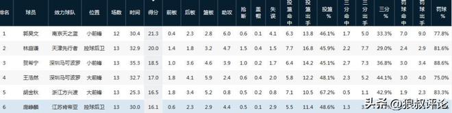 截止目前,庞峥麟代表江苏出战13场比赛,场均登场30分钟,得到16.1分2.9篮板4.4助攻,投篮命中率为48.6%。排在本土得分榜第六的位置。