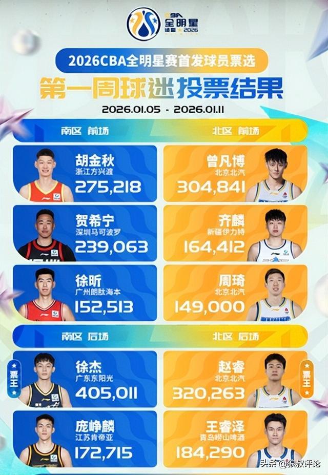 徐杰(405,011)、庞峥麟(172,715)、胡明轩(166,659)、郭艾伦(142,880);徐杰当选第一周南区票王。