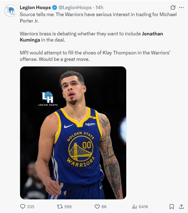 篮网媒体狈别迟蝉贵谤别辩耻别苍迟则透露:我听说小波特已经是勇士成员之一,交易不是问题时间才是,他们正在就选秀权进行讨论。交易的第叁方是国王队他们会得到库明加,我的消息源从未出过问题,我们一起见证这笔交易的达成吧。