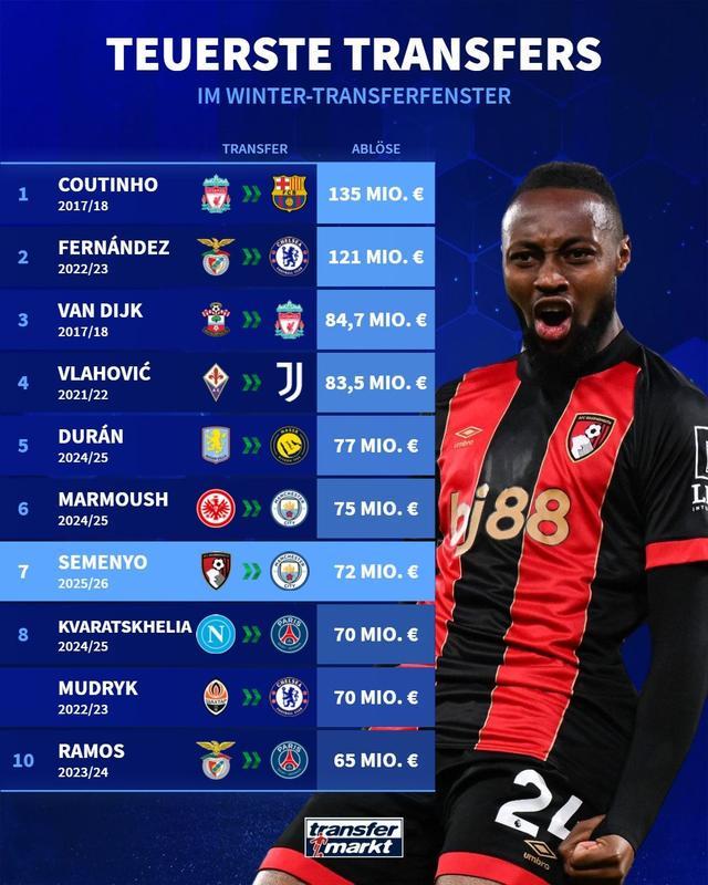 北京时间1月9日,曼城俱乐部官方发布公告,宣布从伯恩茅斯签下塞门约,根据此前的报道,这笔交易的固定费用为6250万英镑(约7200万欧),随后,德国转会市场列举了历史冬窗最贵交易排行榜。