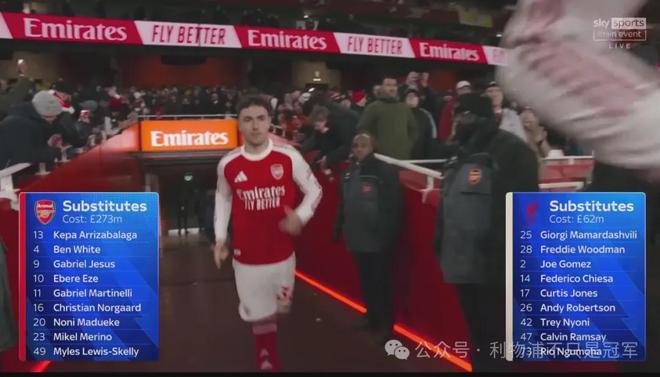 这首先是因为阿森纳有人可换啊!下半场开始前,天空体育打出对比:两队替补席“造价”,阿森纳2.73亿英镑,利物浦不到阿森纳的零头,6200万英镑。