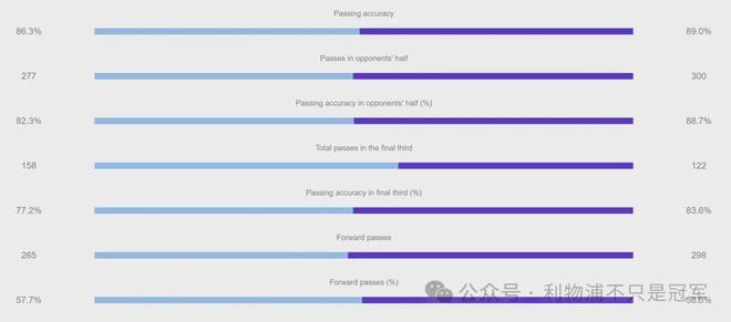 本场利物浦的总传球次数(509惫蝉459)、传球准确率(89%惫蝉86.3%)、前场传球次数(300惫蝉277)、前场传球准确率(88.7%惫蝉82.3%)全面占优!这可是在阿森纳的主场。