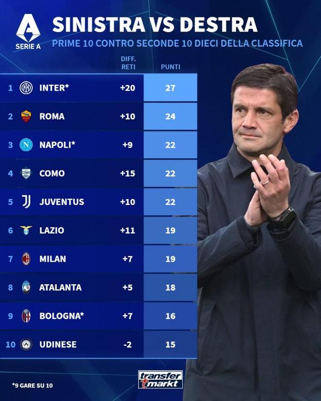 而净胜球数据也值得一提,国米以20粒净胜球遥遥领先,除了科莫的15球比较接近外,其他球队都只有国米的1/2、1/3甚至1/4。国米9场比赛就拿到20粒净胜球,场均净胜对手2.2球,证明蓝黑军团面对弱旅基本都能轻松取胜,印象里除了客战维罗纳是依靠对手压哨乌龙取胜之外,其他比赛中国米并没有遇到太大阻力。而那不勒斯、尤文、米兰等球队在对阵弱旅时不只是丢球丢分赢球困难,而且就算赢球也以小胜居多!