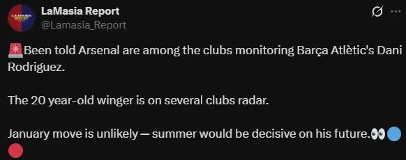 《E-Noticies》指出,由于亚马尔稳坐巴萨主力位置,罗德里格斯在短期内很难获得进入巴萨一线队的机会,弗里克对他的转会持开放态度。而另一消息源、专注巴萨青训的X账号LaMasia Report(近2万粉)也证实:“阿森纳正在关注巴萨B队的达尼·罗德里格斯。20岁边锋已进入多支球队视野,一月转会可能性低,夏天将成关键节点。”