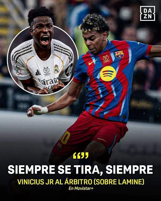 另外,现场的录像还捕捉到,当巴萨球员亚马尔屡次带球倒地之后,皇马球员维尼休斯向场上的主裁判投诉亚马尔,“他总是假摔,总是”。不过尴尬的是,主裁判并没有回应维尼休斯,也没有做出任何表示。