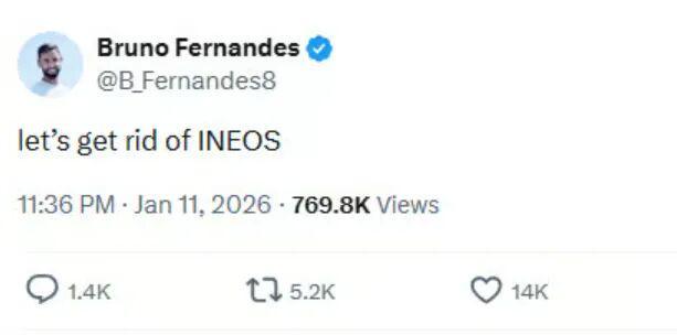 在曼联足总杯遭到布莱顿淘汰后,队长布鲁诺·费尔南德斯的社媒账号发出一条惊人的炮轰老板吉姆·拉特克里夫爵士的信息:「干掉英力士!」