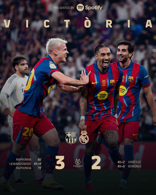 早些时候,巴萨传奇罗纳尔迪尼奥转发巴萨俱乐部社媒的庆祝贴文,并写道:“CAMPEONES SUPERCOPA! (超级杯冠军!)”